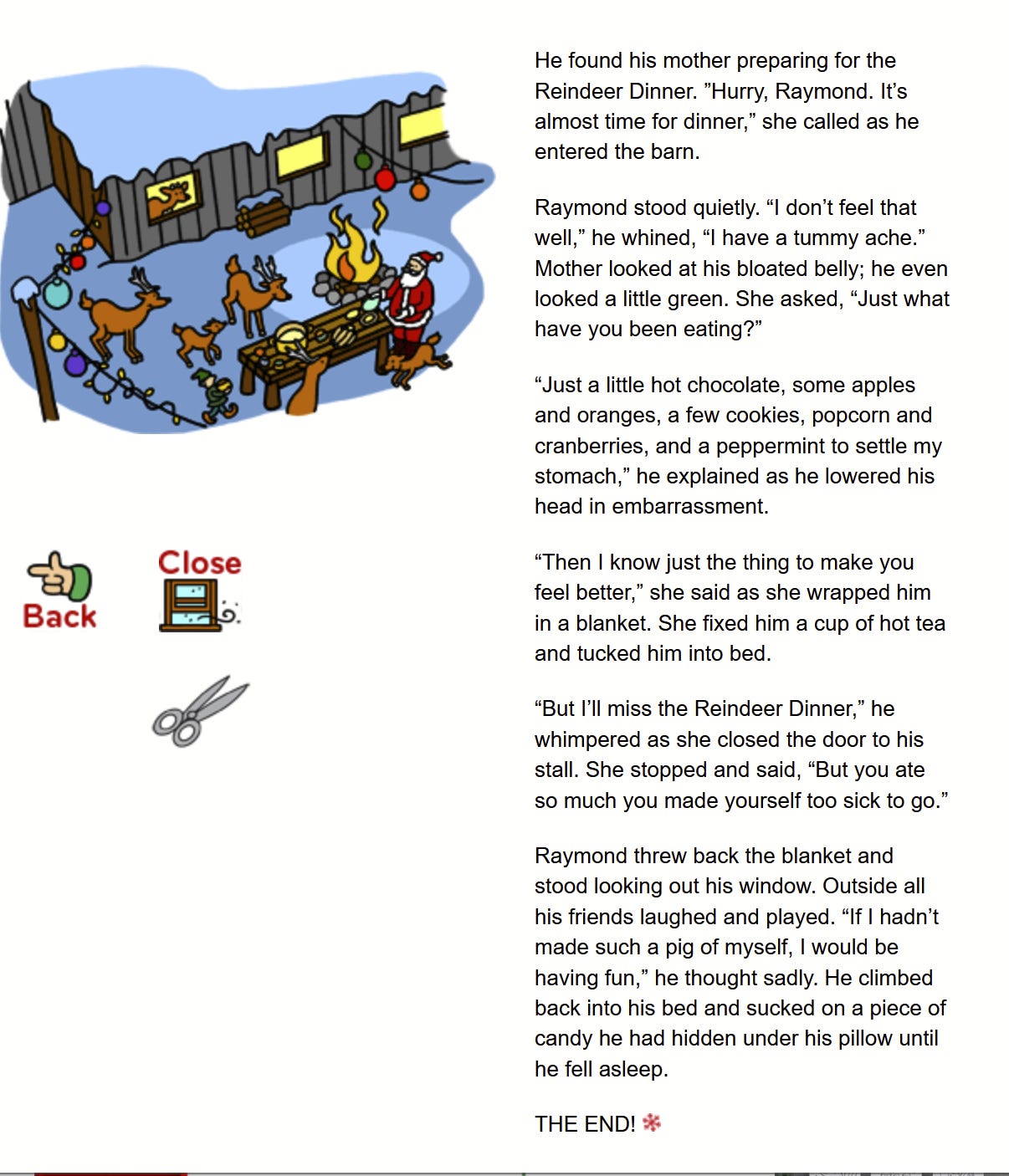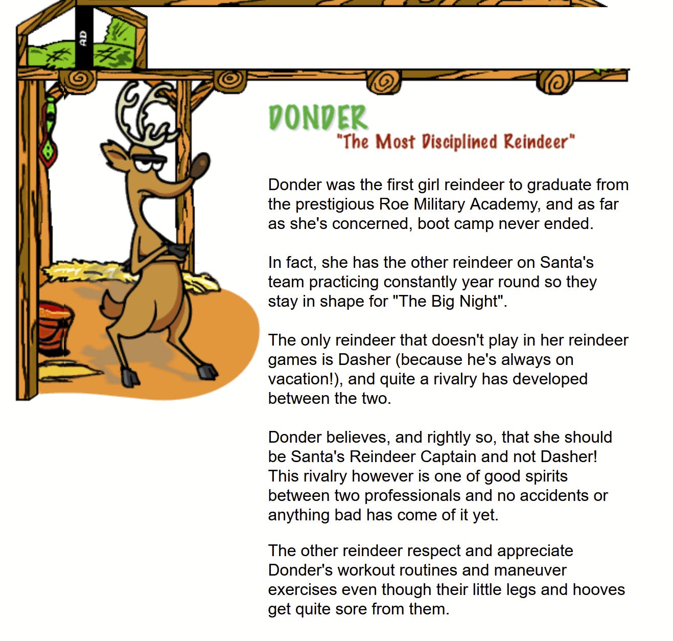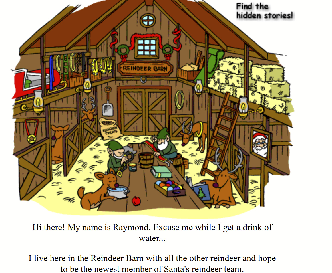 The Reindeer Barn at Northpole.com centers around the exploits of a rather dickish baby reindeer named Raymond. (Raymond the Reindeer. Pathetic).