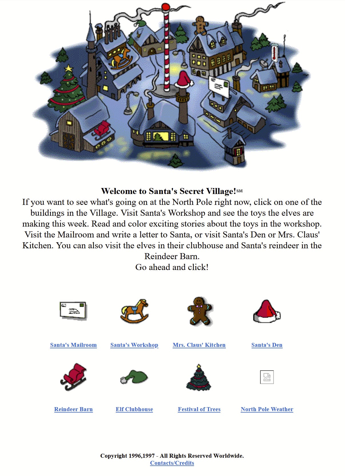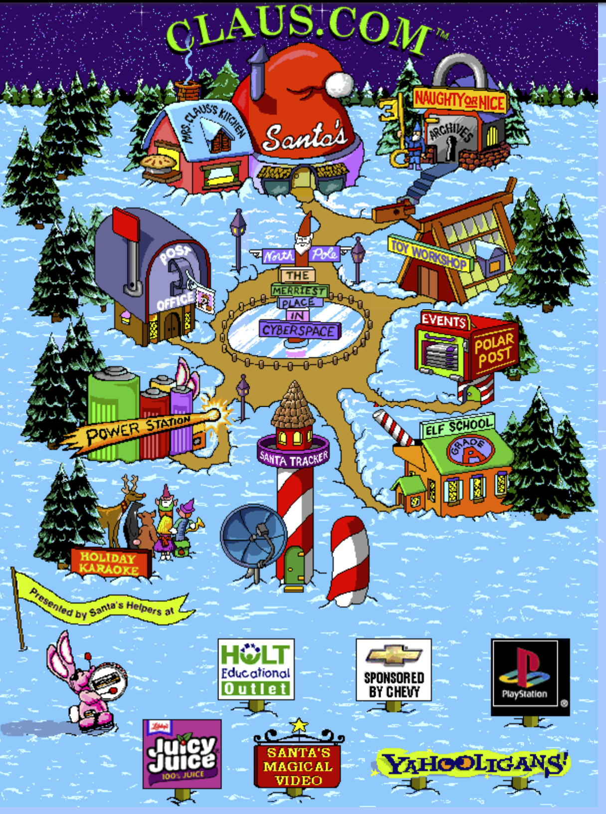 The central navigation, like most of these sites, revolved around a cartoon pastiche of Santa’s village. Corporate sponsors lined the bottom of the page, reminding you who kept the goddamn lights on in Santa’s village.