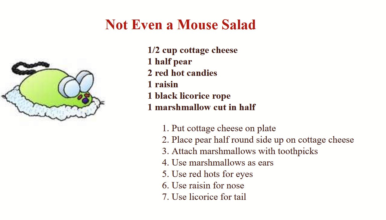 Clicking through the preserved-in-amber website (like a primordial mosquito) is a journey through the world as it was in the late 90s and early 2000s. Click on Mrs. Claus’s Kitchen and you’ll find plenty of bizarre recipes, sponsored by Keebler. Look at this “Not Even a Mouse Salad” and consider that at some point in the last 25 years, a child has demanded to make this, and an adult has had to pretend to enjoy a pear with Red Hot candies and licorice stuck into it. That’s probably a war crime.