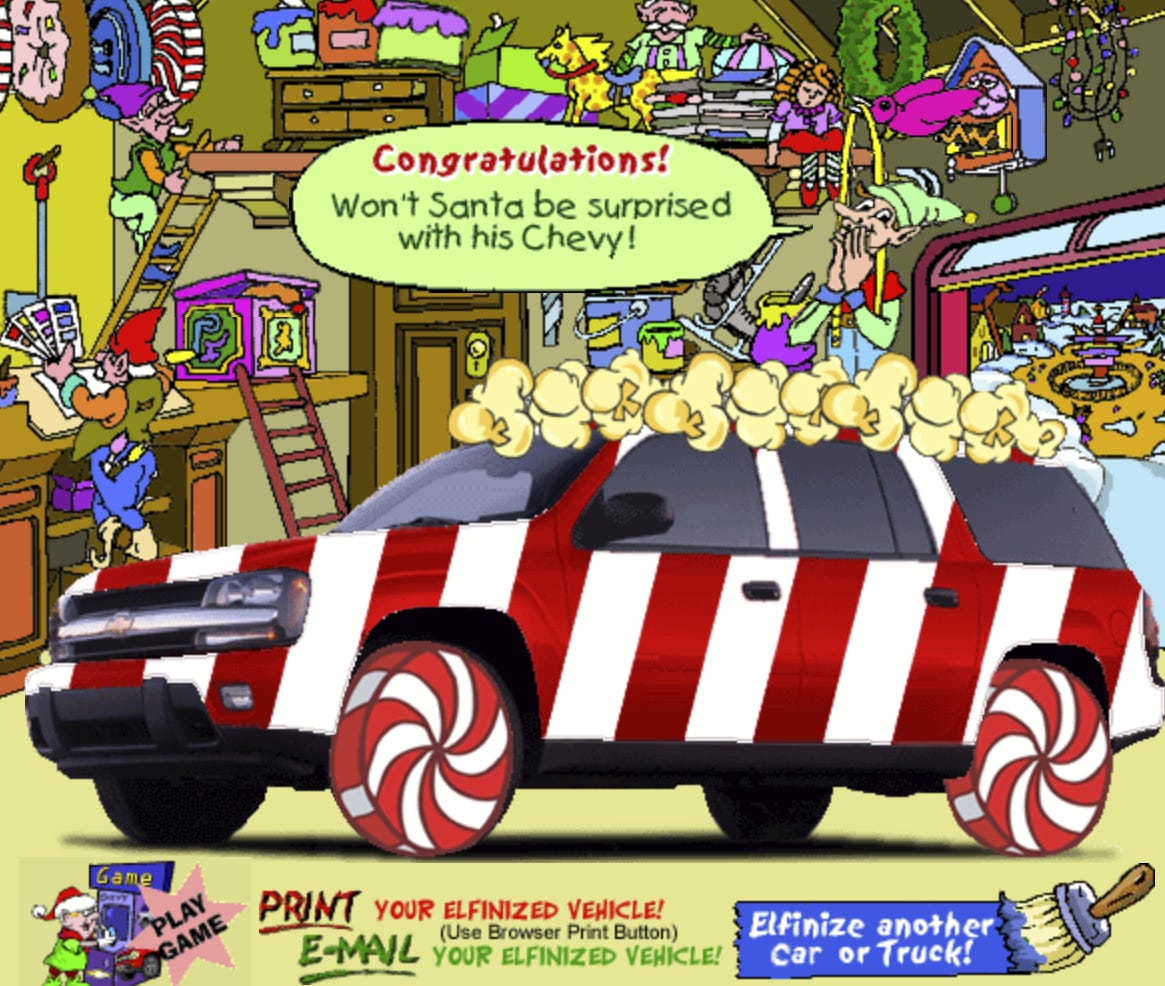 Clicking on Santa’s freakish hat-shaped house reveals to us that Santa is, for some reason, the owner of a fleet of mid-range Chevy vehicles - and you, the child-user, were invited to Elfinize them. (That’s a verb that I’d like to get more people to use, since we live in the end-times anyway). Here I have, with the raw power of technology, elfinized a 2002 Chevy Trailblazer.