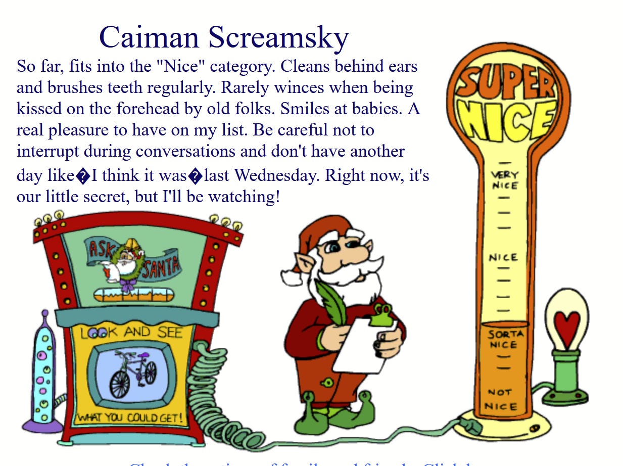In retrospect, this prepared my generation well for an adulthood of being endlessly judged by arbitrary computer algorithms whose workings are concealed to us. Santa’s Nice or Naughty List is a black box, and the box only pretends to care about you as an individual.