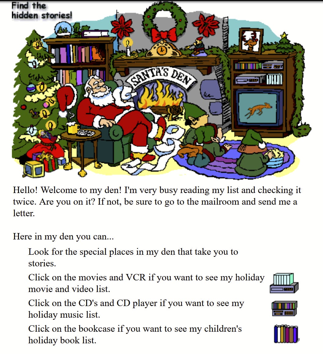 These websites were remarkably popular with Millennial-aged children who were old enough to be plunked in front of a computer by their parents. By 2002, per this New York Times piece, Claus.com was attracting 9.5 million visitors a year. That’s a substantial number of children experiencing holiday cheer via the Internet, in the era before iPads.