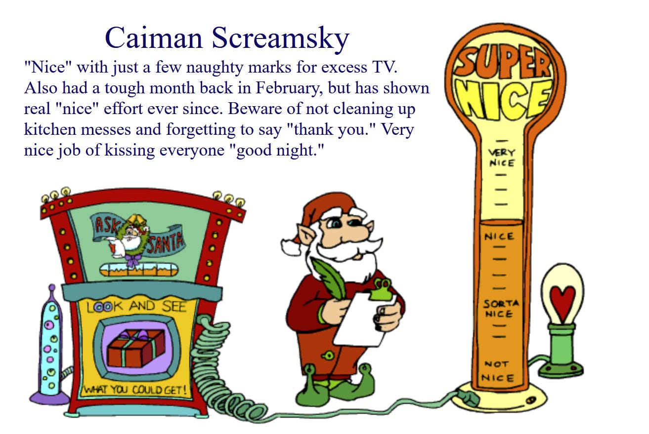 Santa will also creepily note that you did something bad on a *specific day or month*. Sometimes, the child is informed that they only just barely squeaked through onto the Nice list, and that Santa is watching intently for any regressions to the slovenly mean. And people blame millennials for being wracked with anxiety.