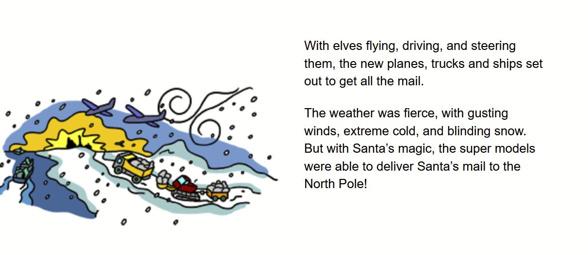After extreme weather threatens to ruin the avaricious-children to Santa wish-list delivery pipeline, Santa realizes that his workshop is lousy with model airplanes, trucks, and ships. And thus, with some “magic dust",” Santa winterizes the models and imbues them with some sort of doubtless deeply unnatural artificial intelligence.