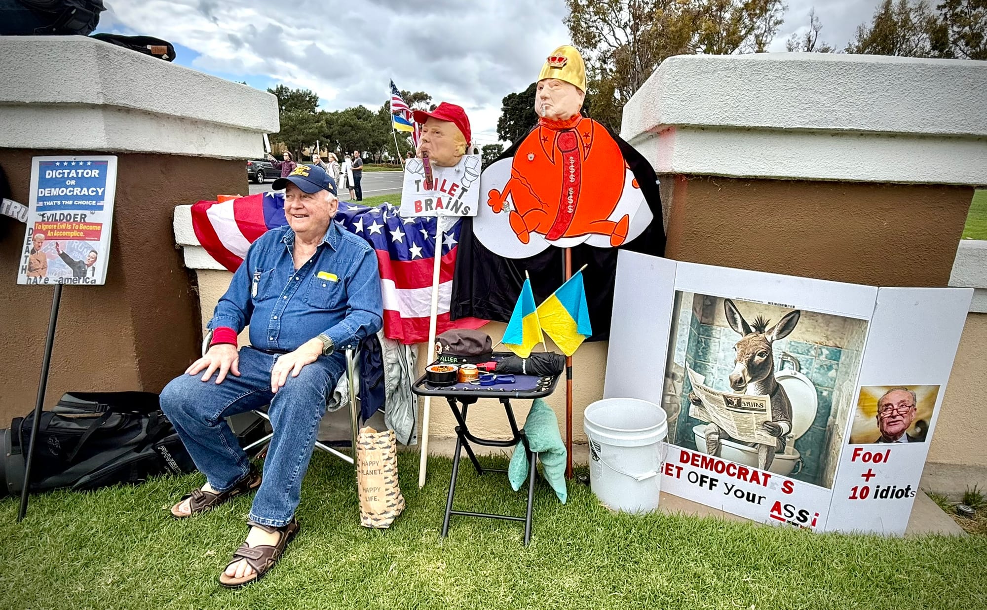 It is also encouraging to remember that people are protesting right now, even if the media too rarely reports on it, and even if the usual assortment of boring blowhards on social media dismiss said protests as Inadequately Hardcore because they're not fire-bombing a Wal-Mart. I went to the regular Sunday protest organized by the 50501 Movement in Irvine the other day, and it was a wholesome experience: a few hundred nice, normal people with their dogs and their kids and handmade signs, parading up and down a four-way-intersection outside of City Hall in tandem with the street lights.