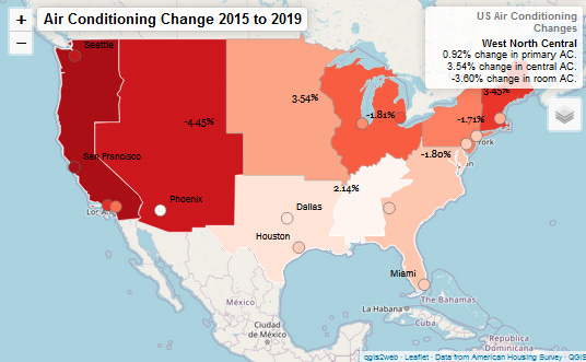I made another interactive map of changes in US air conditioning rates between 2015 and 2019 for a class I’m taking. While the Pacific and the Northeast have historically been rather skeptical of the Demon Box that Makes the Cold, they're catching up fast. In Seattle, homes with some kind of AC increased by 10.27% between 2015 to 2019, while that rate has jumped by 7.46% in the Pacific region.