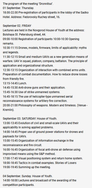 The September 1st to 5th Dronnitsa event was first announced on August 1st. Organizers from the Coordinating Center for Assistance to Novorossia, or KCPN, claimed that it would bring together over 100 combat drone pilots, civilian drone experts, students, and wannabe pilots by the symbolically-laden shores of Ilmen Lake in the historic city of Veliky Novrogod.