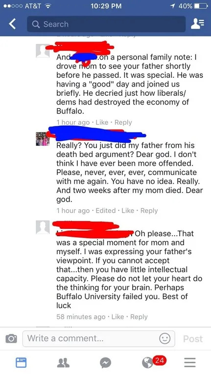 The second-cousins of people I’d vaguely known in high school accused my actual friends of being Soros-funded shills for global Jewish conspiracy. I watched as real-life friendships crumbled, families decided they’d never speak to each other again, and parents accused children of being blood-sucking, welfare-exploiting Communists.