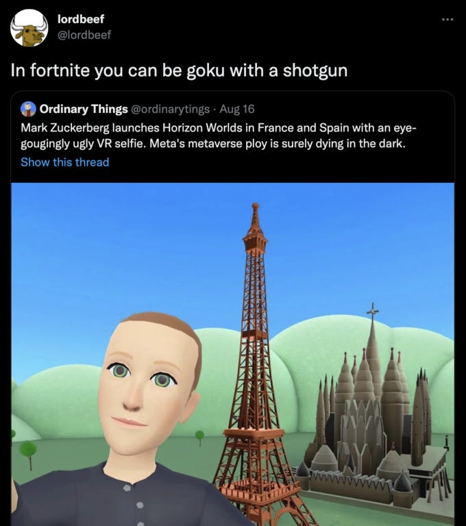 What’s more, the whole shambling horror would be pivoting operations over to something he’d dubbed the Metaverse, an incomprehensible concept that was - I think, it’s terrifically hard to say for sure - positioned somewhere in between hideous NFTs of vomiting apes, The Blockchain (such as it is), and a 2005-era VR video game where you don’t have any legs. Supposedly, it was a play to attract more young people, more hip people, to Meta’s increasingly geriatric lineup of products. After all, nothing says youthful cool like dropping fake computer money on virtual branded estate.