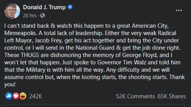 President Trump then, in the course of making his own contributions to the fire hose of racist bullshit that swirled around the Internet at the time, crossed a line. In ominous May 29th posts on both Facebook and Twitter, he declared that “once the looting starts, the shooting starts.”