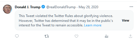 Twitter acted relatively quickly to limit the public’s ability to view or interact with Trump’s post, citing their rules against “glorifying violence.”