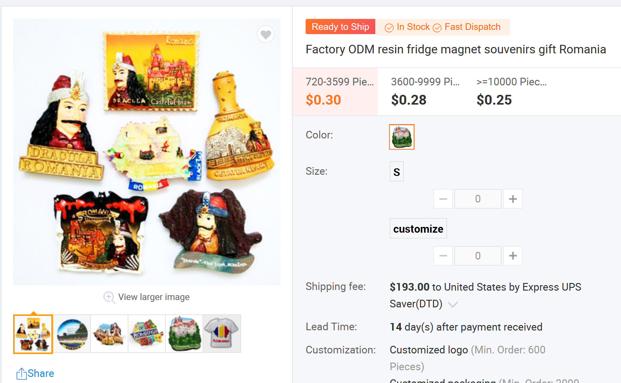 The GlobalSources website offers over 3000 styles from 463 manufacturers: for example, a Chinese-made "soft rubber 3D" fridge magnet for the Saudi city of Riyadh retails for between $0.1 and $0.6 each, for a lot of 100. Just about ever souvenir magnet ever made for every location on earth is available from Alibaba: there, you can buy 1000 rubber magnets advertising the Iraqi city of Basra with a smiling camel on them, or 720 resin fridge magnets for Romania with Vlad the Impaler on them.