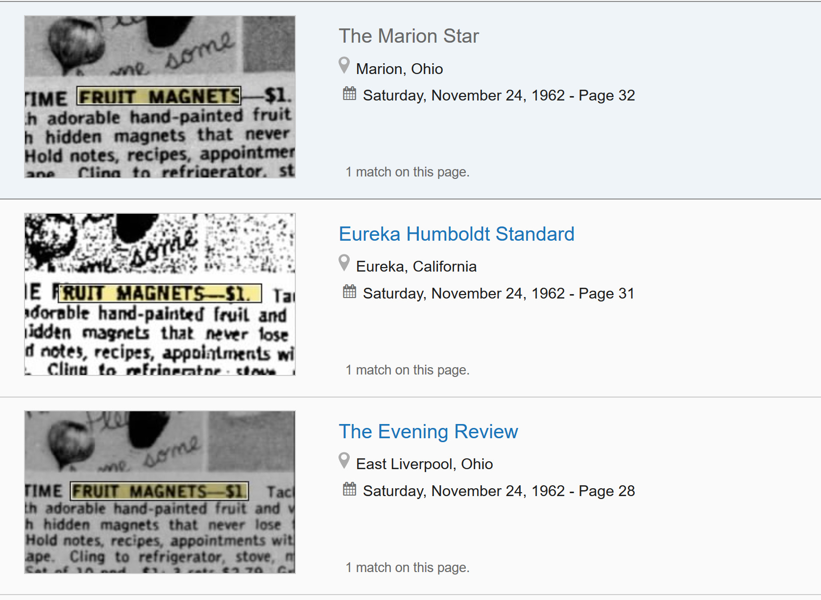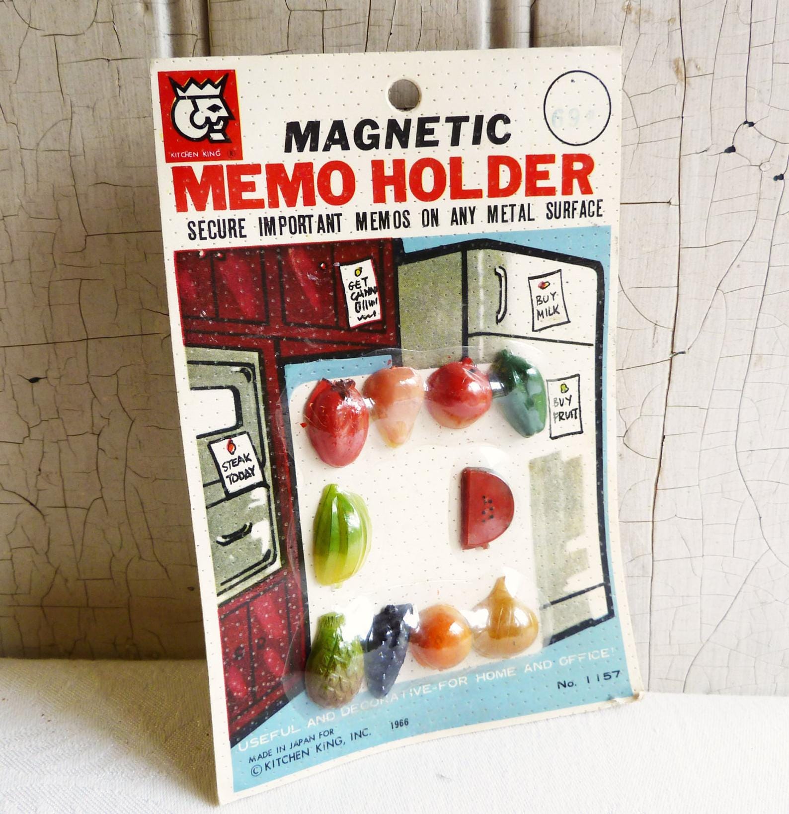 These early fruit magnets were advertised as “decorative magnets” or “memo-holders,” and they were manufactured in Japan or in Hong Kong, than sold to U.S. markets from distributors based in New York, New Jersey, and California. I have to assume that the true inventor of the decorative fridge magnet was thus someone located in Asia, a person whose history is, sadly, even more cryptically documented than William Zimmerman’s is.