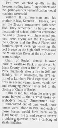 I found a news story about the closure of the Chain of Rocks amusement park in 1978 describing the final auction of the park’s assets, the selling-off of Ferris wheels and freezers and the various small architectures of theme-park entertainment. Near the end of the piece, the writer describes two quiet men, looking at the proceedings with grim, resigned faces. It was William H. Zimmerman, watching the park be dismantled: he and his brother-in-law and co-owner had to give up on the place, after a succession of fires and vandals and diminishing returns. “This is sad, but when the merry-go-round burned – that’s what broke everybody’s heart.” Zimmerman tells the reporter. Then he turns away “to answer a bidder’s question about a carbonated slush machine.” His obituary was published in May of 1992. He donated his body to science, and requested no visitation.