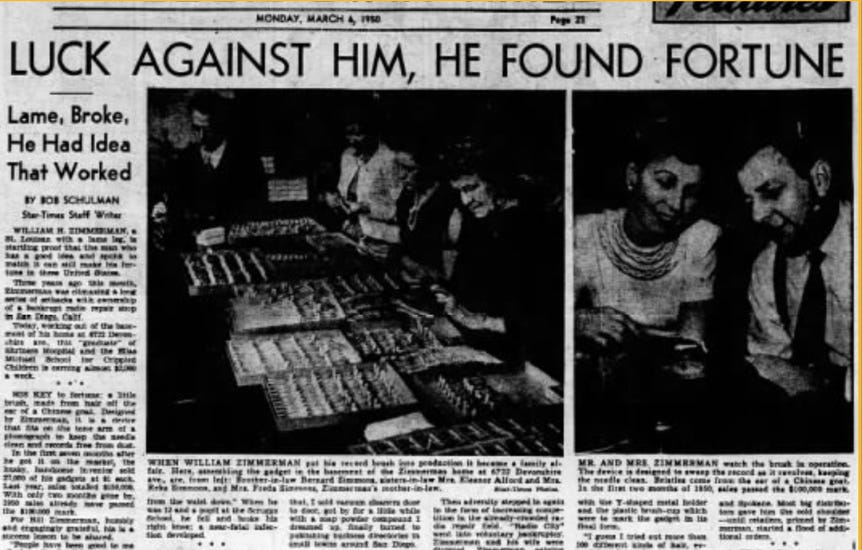 The paper described him as a formerly “lame and broke” man who had turned into a “husky and handsome inventor,” a scrappy survivor-type who had suffered a serious injury to his hip as a child that left him with a permanently stiff leg. He’d spent much of his youth in California trying everything from door-to-door vacuum sales to working in an aircraft factory, up until he came up with his great idea about record brushes (which were made with bristles improbably sourced “from the ear of a Chinese goat.”)