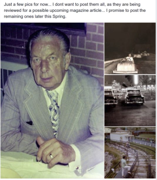 So William Zimmerman had lived in St Louis, and probably knew something about magnets, but I still couldn’t find any evidence that he’d done something with the kind that go on the fridge. Until I came upon a Facebook page dedicated to Holiday Hill, one of the long-since dismantled theme parks that he used to own. Dozens of people posted photographs of the theme park and the people who ran it, and one of those people had posted a sepia-tinged photograph of William Zimmerman, taken sometime in the 1960, unmistakably the same man as the one in the 1950 article.