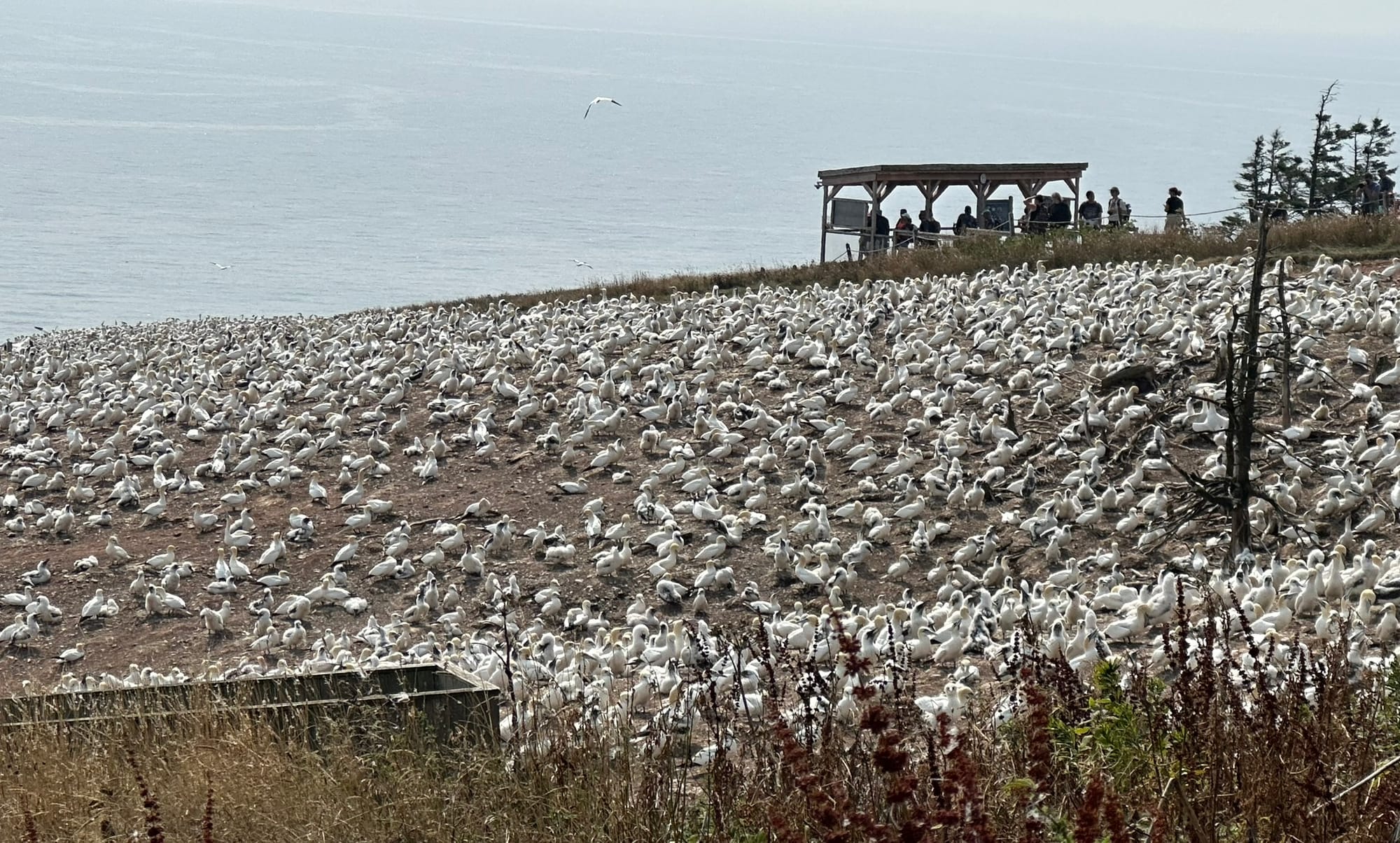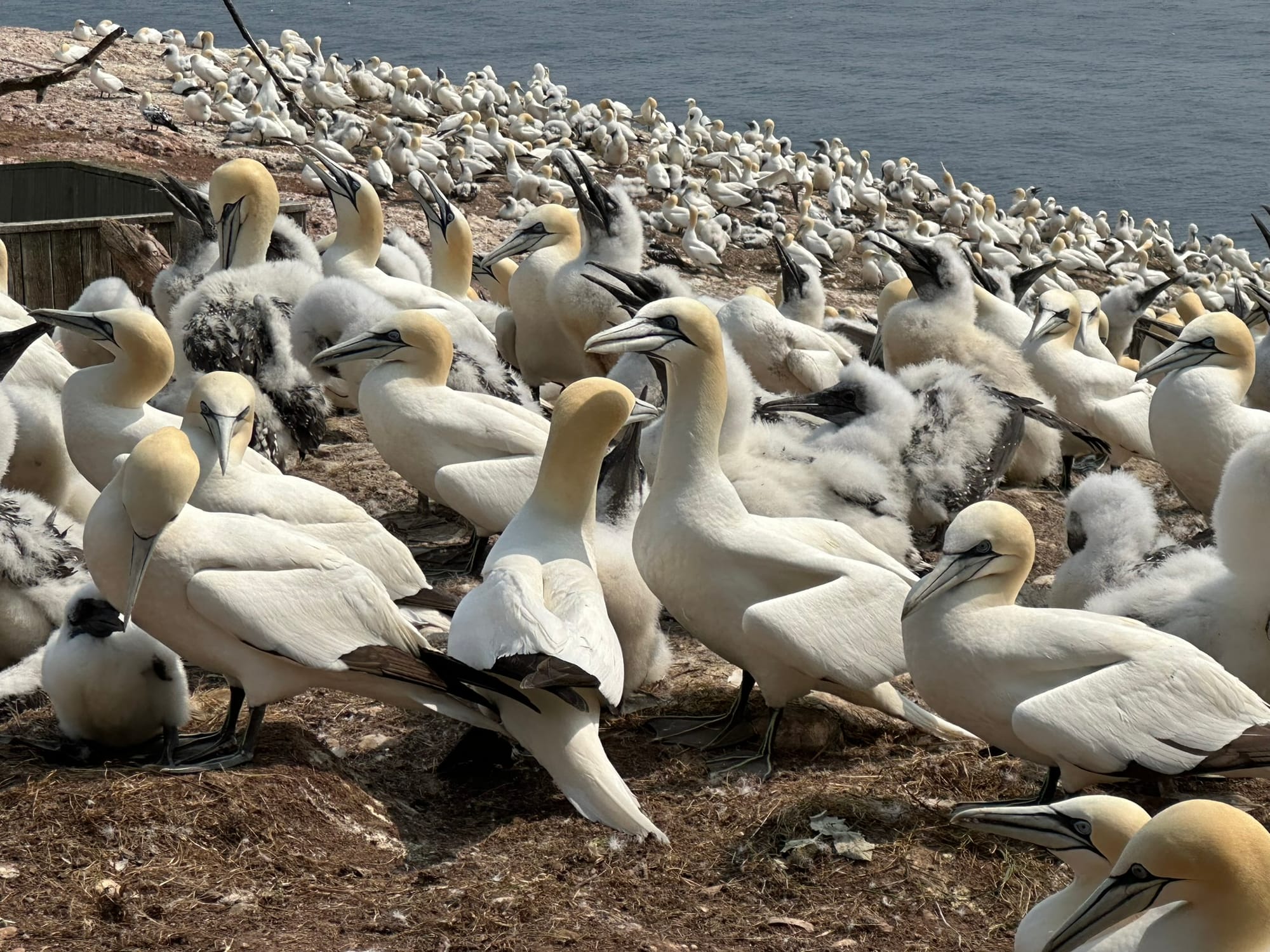 You reach the gannet colony by means of a pathway crossing the island from the main dock, which was an enjoyable wander through thick pine forests and glorious summer-time wildflower meadows, reaching down to the sea. You will almost certainly hear - and smell - the gannet colony before you reach it, and once you do, you'll find yourself overlooking many thousands of birds engaged in a constant process of gyrating, making weird noises at each other, and puking up fish for their spouses and children. I wonder if that's pretty much what human cities look like to other organisms. Probably.