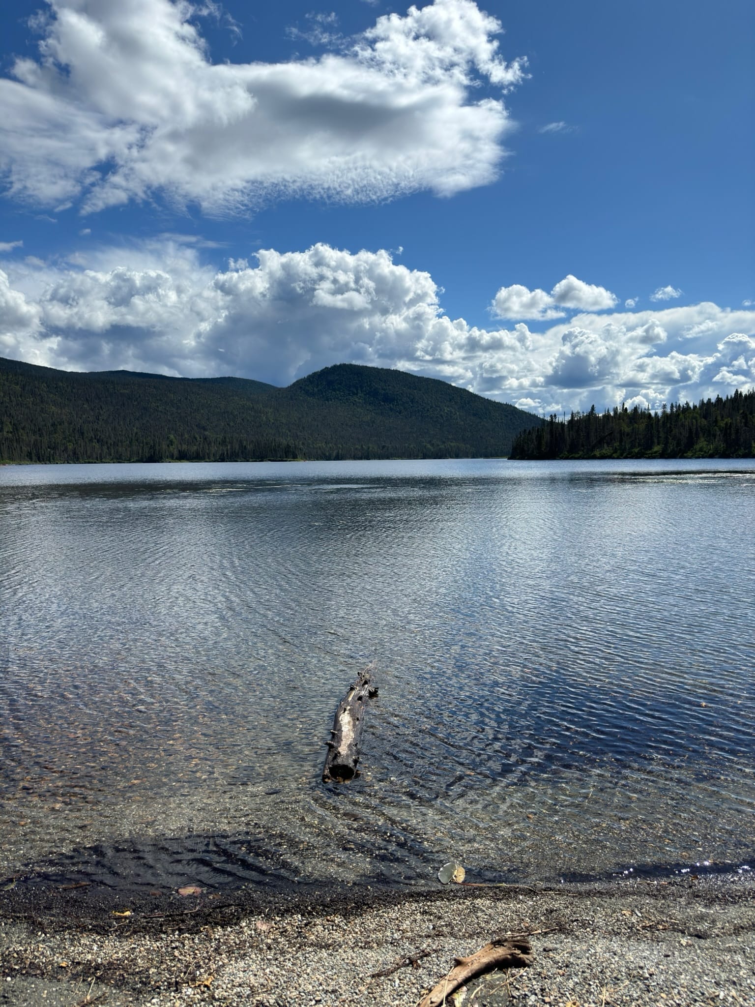 We paused at the Rivière-Cascapédia trailhead to eat a sandwich for lunch, where we ate Subway sandwiches (the only thing open in town) in the remarkably antediluvian-feeling pine forest around us, where stringy white lichens dripped from the trees, little unseen birds yelled at each other from the boughs and bushes, and fresh raspberries grew in profusion from the bushes.