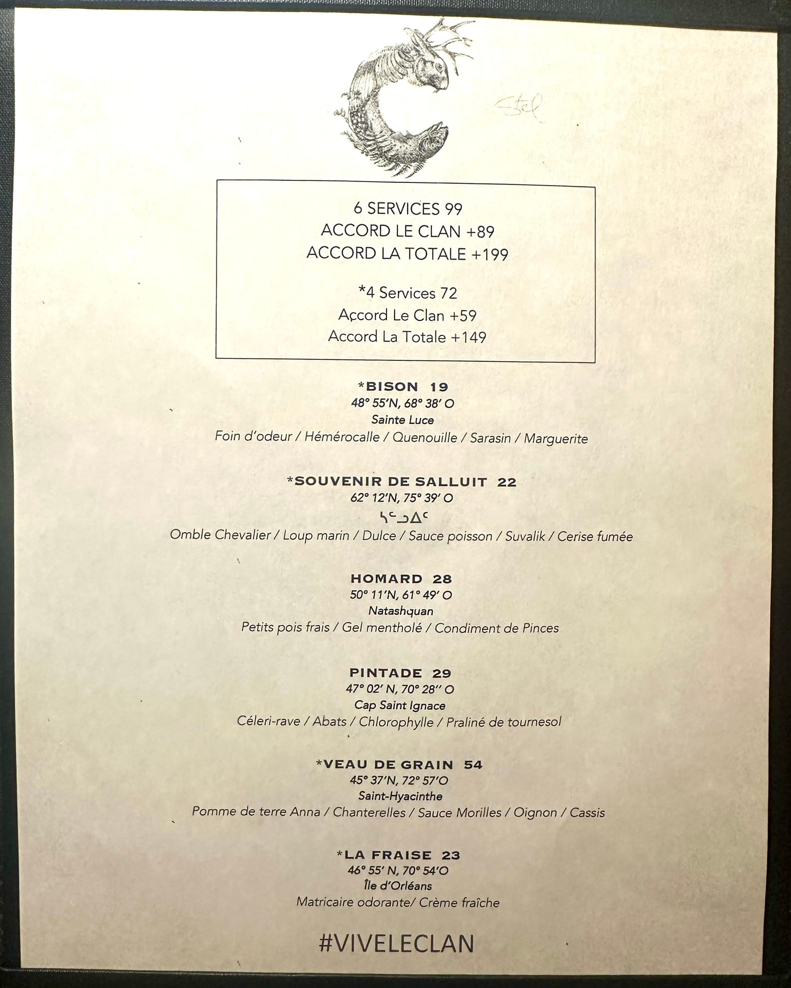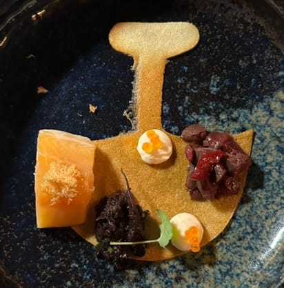 tasting menu dishes at Le Clan, including seal and Arctic Char