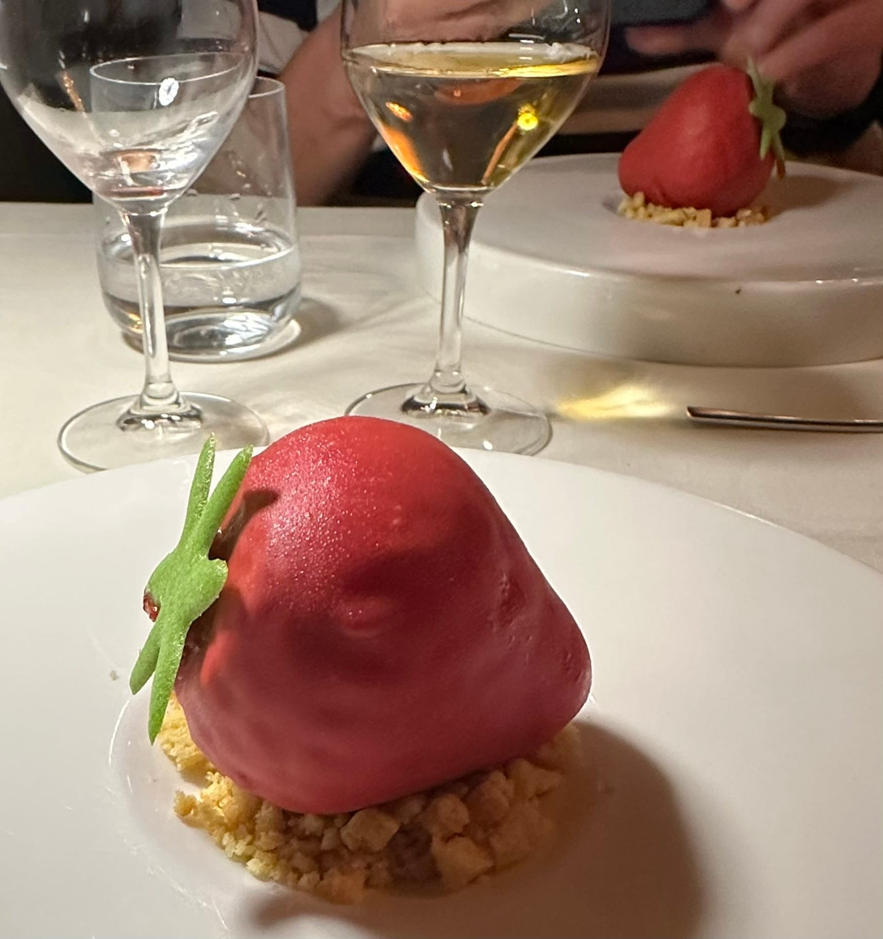 As part of the tasting menu, we both got a chance to sample seal meat for the first time, which was served with arctic char (omble chevalier), suvalik (a kind of Inuit fruit salad), seaweed, fish sauce, and smoked cherries - dishes all inspired by the chef's visit to Nunavut to learn more about Inuit cooking and food culture. Seal, as it transpires, tastes a lot like the meat of a cow that's taken up a free-wheeling aquatic lifestyle, not unlike how alligator tastes like fishy chicken. Other stand-out dishes included a delightfully summer-like lobster with fresh peas, and a strawberry sponge cake made to look uncannily like a strawberry you'd consume as a power-up in a video game.