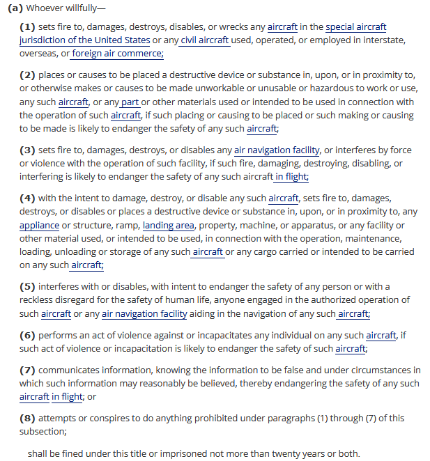 Per official DHS guidance, these laws could very well include the Computer Fraud and Abuse Act (18 U.S.C. § 103), Interference with the Operation of a Satellite (18 U.S.C. § 1367), Communication Lines, Stations, or Systems, (18 U.S.C. § 1362), the Aircraft Sabotage Act, (18 U.S.C. § 32(a)), and the Aircraft Piracy Act (49 U.S.C. § 4650).