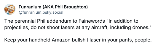 However, much as I'd like to see some sensible changes made to how we're implementing remote ID that make it easier for the public to figure out what's going on with drones in their area, it's 2025. I am not exactly filled with confidence in the current occupant of the Oval Office. We'll see.