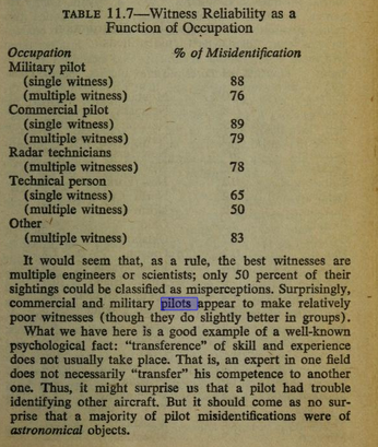 And while you might assume that specially-trained individuals are better at this than the average human, that may not be true. According to astronomer Allen Hynek's famous 1977 "UFO Report," professional pilots actually tend to be particularly bad at accurately identifying flying objects: