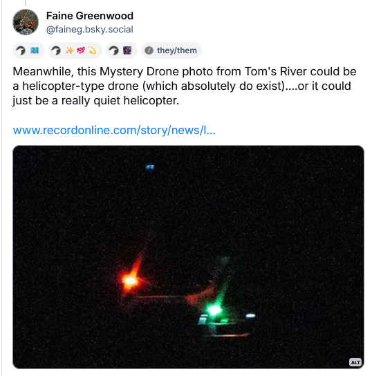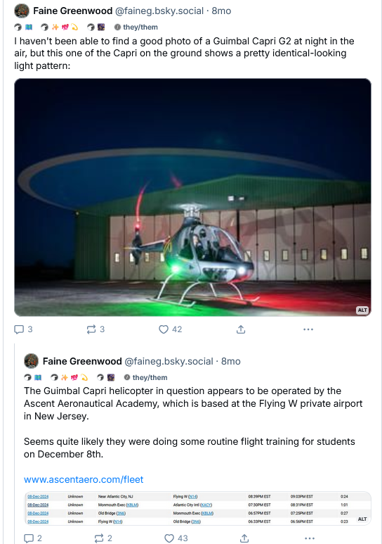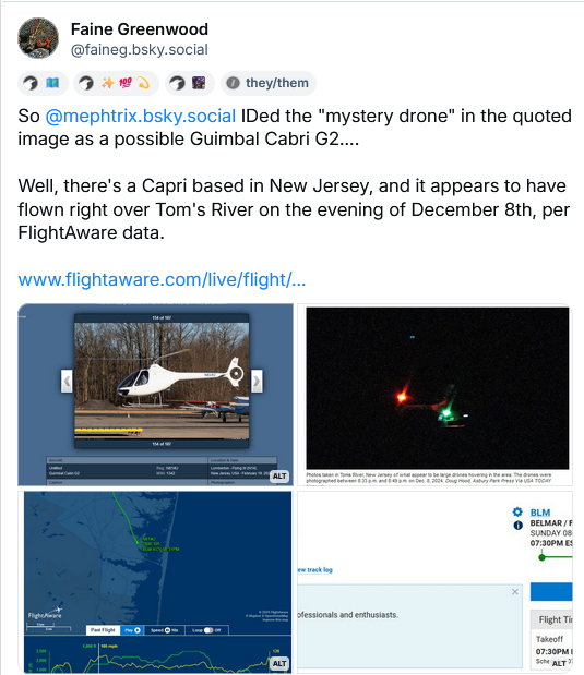 For example: during the peak of the mystery drone panic, New York's Times Herald-Record newspaper published a photo of an alleged "large drone," taken by an area resident. A friend of mine on Bluesky quickly identified the supposed "drone" as a manned Guimbal Cabri G2 helicopter - and I was able to match that aircraft up with a documented night-time training flight out of an aeronautical academy.