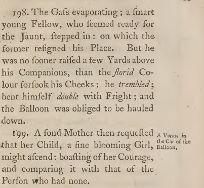 He also grumbles that the French have thoroughly beaten the British in the field of balloon research because while they “admire liberty, Montesquieu’s “Spirits of Laws may determine; but they are not addicted to Politics…their nobility are endowed with a liberal and enterprising spirit…. They have leisure and are sober.”