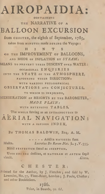 Thomas Baldwin, writing his treatise (as such publications were charmingly called back then) in 1786, sounds eerily like the hobbyists, drone and otherwise, we encounter today. Airopaidia is split into technical experiments, observations on the aerial journey itself, and some technical content (for the academically minded).