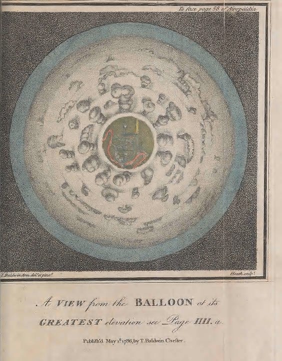 Weirdly enough, as Dr. Marie Thébaud-Sorger points out in her chapter in the excellent “Seeing From Above: The Aerial View in Visual Culture,” Baldwin was perhaps the only balloonist of his era who actually bothered to write, in detail, about the actual experience of ballooning. While Baldwin says this himself in the opening of Airopaidia, it’s easy to dismiss it as the usual egotistical puffery from 18th century Men of Science.