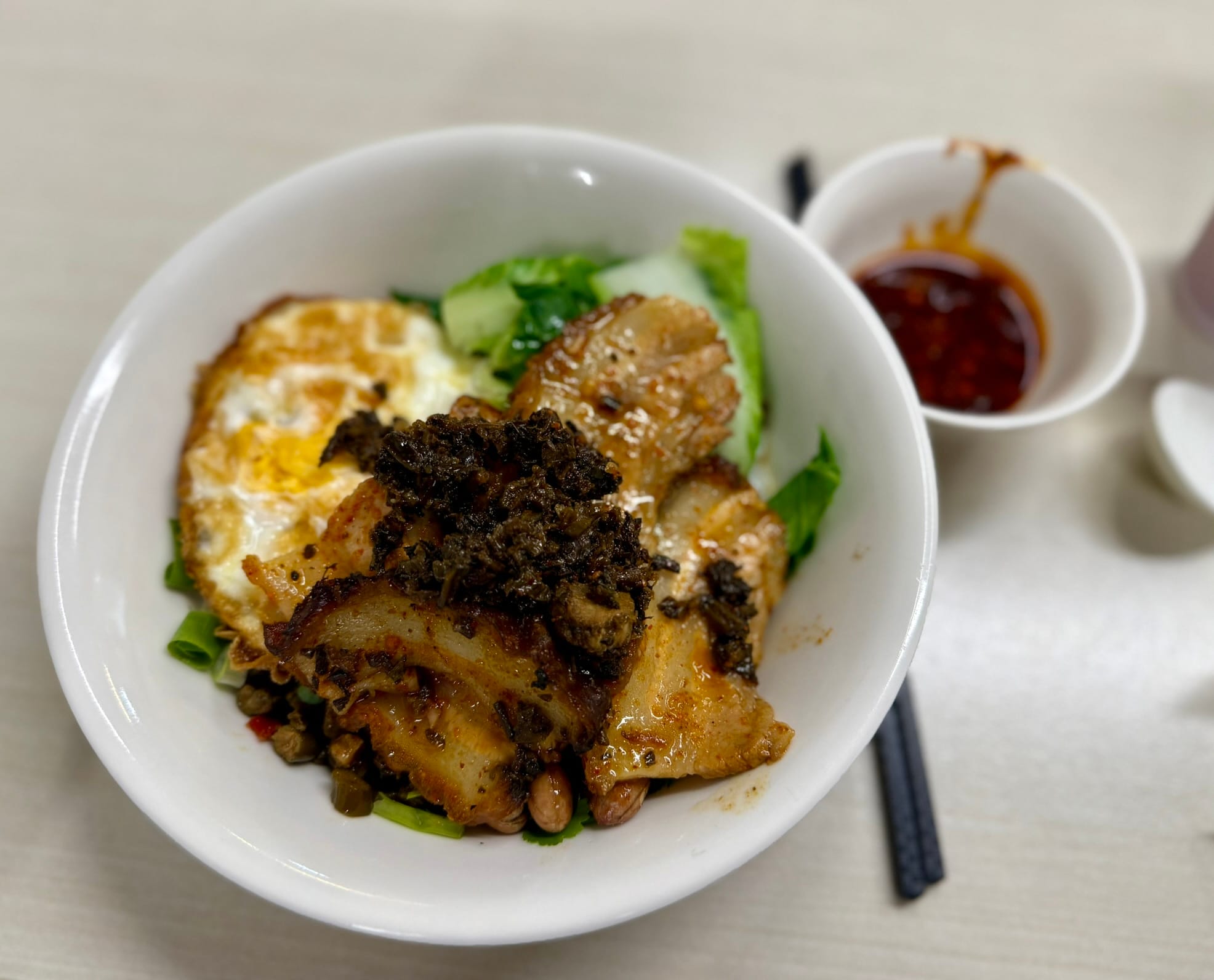 Excellent beef noodles with great chile crisp on the side. Plentiful blanched vegetable options.