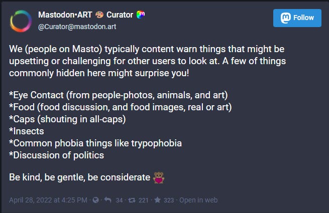 Although I don’t like Mastodon, I think the general idea of federated social media is incredibly valuable, and in an way, I’m grateful that Twitter’s twitching death has convinced so many people to try out platforms that are experimenting with the idea.