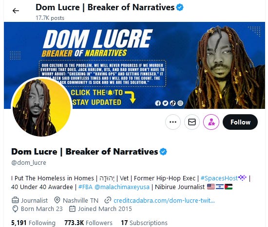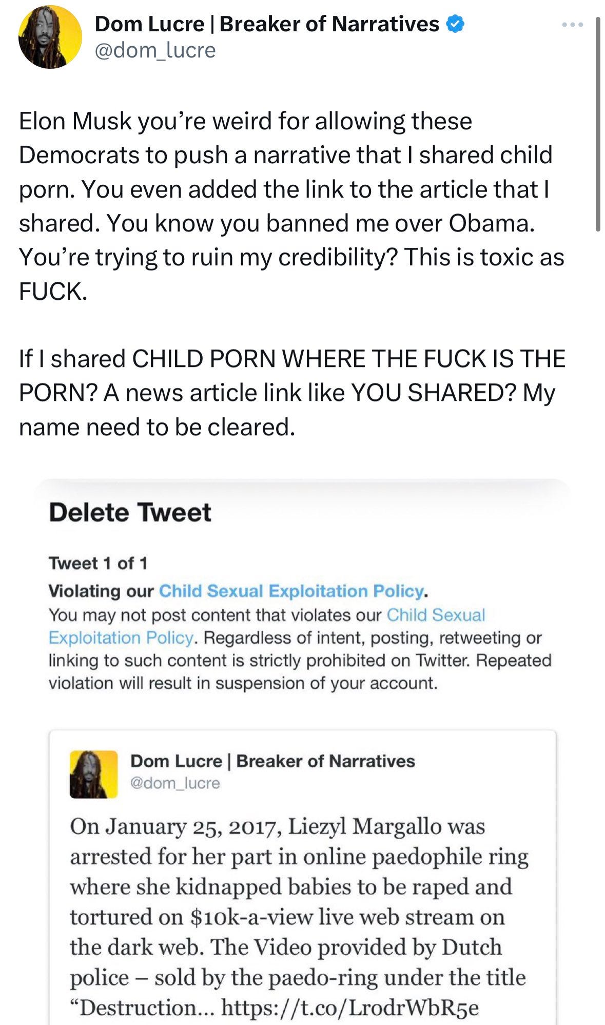 He reinstated Dom Lucre’s account, and then told a blatant lie about how only Twitter employees had seen the images. Then, a few days later, Elon Musk sent Dom Lucre a check via Twitter’s new affiliate program for big accounts. Lucre whined about the check being too small, and promptly began pushing a narrative about how he’d been suspended for posting copyright music, and how the mainstream media was attempting to assassinate his character.