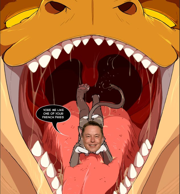 I don’t think anyone really believed that those months of gleeful shit-stirring and offensive memes were actually going to chase Elon off, but it was an important symbolic gesture nonetheless, a virtual middle finger in the face of all modern oligarchs who now demanded not just our money, but also, pathetically, affection they had no intention of earning.