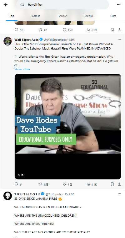Information from reputable outlets about the Lahaina wildfires was consistently and constantly pushed to the bottom of my search results, and it proved almost impossible for me to actually keep up with the latest information on Twitter. Instead, I was served an endless, repeating cycle of the same idiotic, blatantly anti-semitic conspiracy theories every single time I refreshed the website.