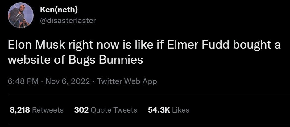 Musk, in his perverse way, reminded a lot of people that their favorite social media hangouts - and their writing, platforms, and social networks built over the course of decades - can be taken away at any time by a single corporate demon with the relative intellect of a tennis shoe.