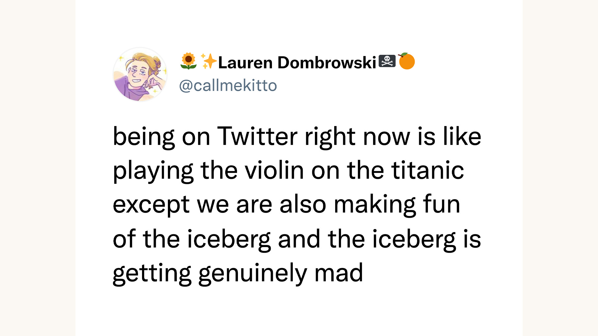 As I participated in all this, I felt a strange sense of excitement about the future, about the unexpectedly open and strange possibilities presented by the sudden downfall of the social media website where I’d been hanging out for over a decade. You could even call it optimism, which had become a horribly rare sensation for me since 2008, the year of both the financial crisis and my first Twitter account. And as I watched Twitter be systematically dismantled, my anger over the entire thing was mixed with a feeling of relief, like an unnameable weight was being lifted off my shoulders for the first time in well over a decade. For the first time in my adult life.