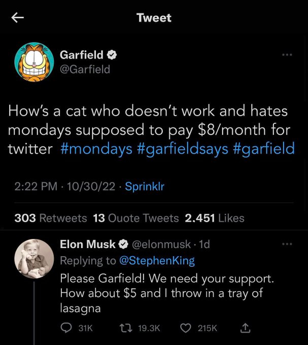 He also bought Twitter because it was not enough for him – for this man who already had too much – that huge swaths of the world admired him, considered him a genius. No, he needed Twitter’s army of shit-posters, that mass of clever weirdos with profile pics that featured a big-assed Garfield smoking weed, to admire him too. And if he couldn’t win the local wildlife over with his posts alone, he’d make those bastards adore him with force. Or destroy the website entirely.