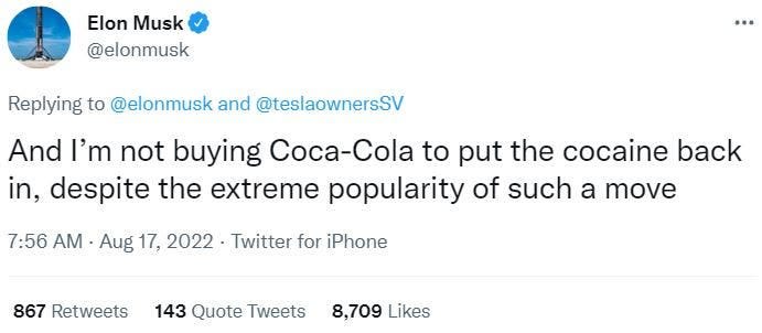 Elon posted more of his weird little guy takes, and more people began noticing his pedestrian weed jokes, his incredibly adolescent world view, and how he posted at a rate that seemed suspicious for a guy who was, supposedly, the CEO of more than one major company.