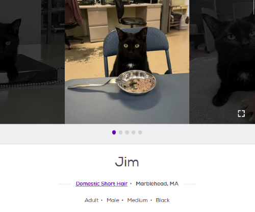 Black rescue cats from the North Shore who look like they might have owned a speed boat before their contracting business fell on hard times. I can't have cats in my current apartment, which is terrible, but someone needs to go adopt Jim from Marblehead.