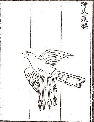 People in China, too, were experimenting with flying explosives by the 1300s. The early Ming Dynasty Huolongjing (Fire Drake/Dragon Manual), an illustrated guide to firearms, includes a picture of a 'divine flying fire crow' (shen huo fei ya), which supposedly functioned as a kind of aerial bomb.