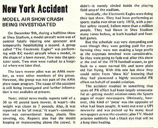 The AMA’s article contradicted other reports of the incident, stating that the model didn’t loop or manoeuvre above the crowd, but instead “merely circled inside the playing field area of the stadium.” Ruefully, writes the AMA, "The accident resulted in something that years of PR effort had been largely unsuccessful at - getting model aviation on the Sports pages of major newspapers…. Model aviation suddenly had a black eye that will be a long time healing."