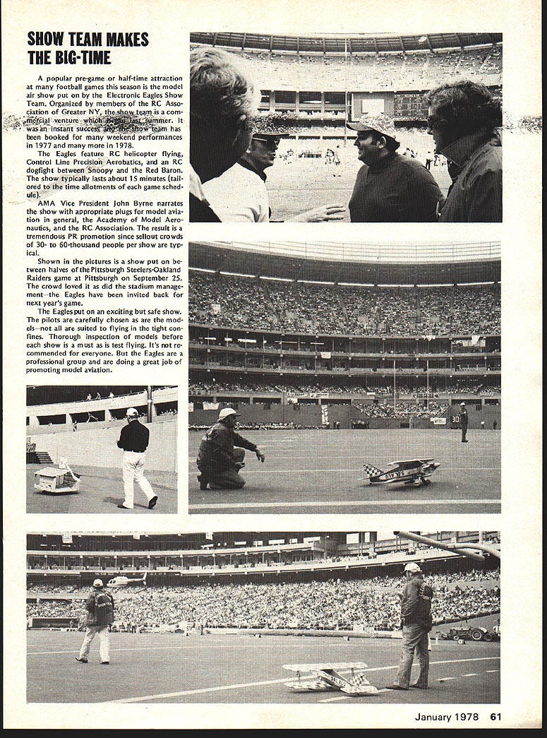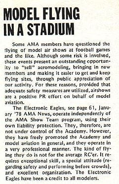 In a December 1977 issue of Model Aviation Magazine, then-AMA President Johnny Clemens described an Electronic Eagles half time show at a match between the Pittsburgh Steelers and the Oakland Raiders with praise: