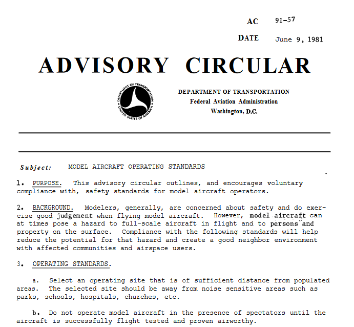 The FAA eventually did do something. In June 1981, the FAA issued an update to the pre-existing 1972 Model Aircraft Operating Standards (which had been published in the pages of the AMA’s magazine). The non-binding Advisory Circular 91-57 would, the FAA hoped, encourage “voluntary compliance with safety standards for model aircraft operators.”