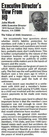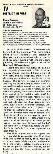 There is, however, a potential clue in the December 1985 issue of Model Aviation: then AMA Executive Director John Worth noted that, in the Shea Stadium case, “AMA’s insurance paid the bulk of the settlement.” You may also notice that this contradicts the February 1978 issue of Model Aviation, where the club states that the Electronic Eagles “operate independently of the AMA Show Team program, using their own liability protection.” (Perhaps they signed up afterwards).