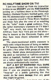 "I just now looked up from my typewriter in time to see SNOOPY and the RED BARON putting on a halftime show at the Pittsburgh Steelers-Oakland Raiders football game. And this RC demonstration was on national TV!" Model plane demonstrations are being used as rest-period or halftime entertainment at baseball, football, and soccer games on a rather regular basis anymore. And they are always enthusiastically received."