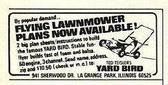 The notion of a flying lawnmower – which is, if you think about, a physical manifestation of a dad joke - dates back to at least the 1970s, and may go back even further. One famous model was designed by RC specialist Ted Teisler, and was advertised as the “Yard Bird.” Model aviation magazines regularly featured advertisements for them. Builders could send away for plans. Other bizarre flying machines were also rather in vogue in the 1970s, like the aerial cheeseburgers featured in a July 1978 issue of Model Aviation.