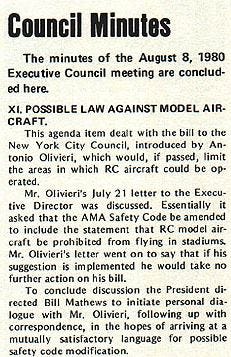In July of 1980, New York City Council member Antonio Olivieri proposed a new bill which would limit RC aircraft operation, including, presumably, in stadiums. Olivieri also took the time to write a letter to the AMA’s executive director, in which he said that he’d let the bill drop if the AMA changed its safety code to prohibit flight in stadiums.