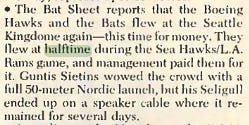 Again, the article makes exculpatory reference to the rather obvious question of safe flight in the crowded confines of a football stadium: “The pilots are carefully chosen as are the models – not all are suited to flying in the tight confines. Thorough inspection of models before each show is a must as is test flying. It’s not recommended for everyone. But the Eagles are a professional group and are doing a great job of promoting model aviation.”